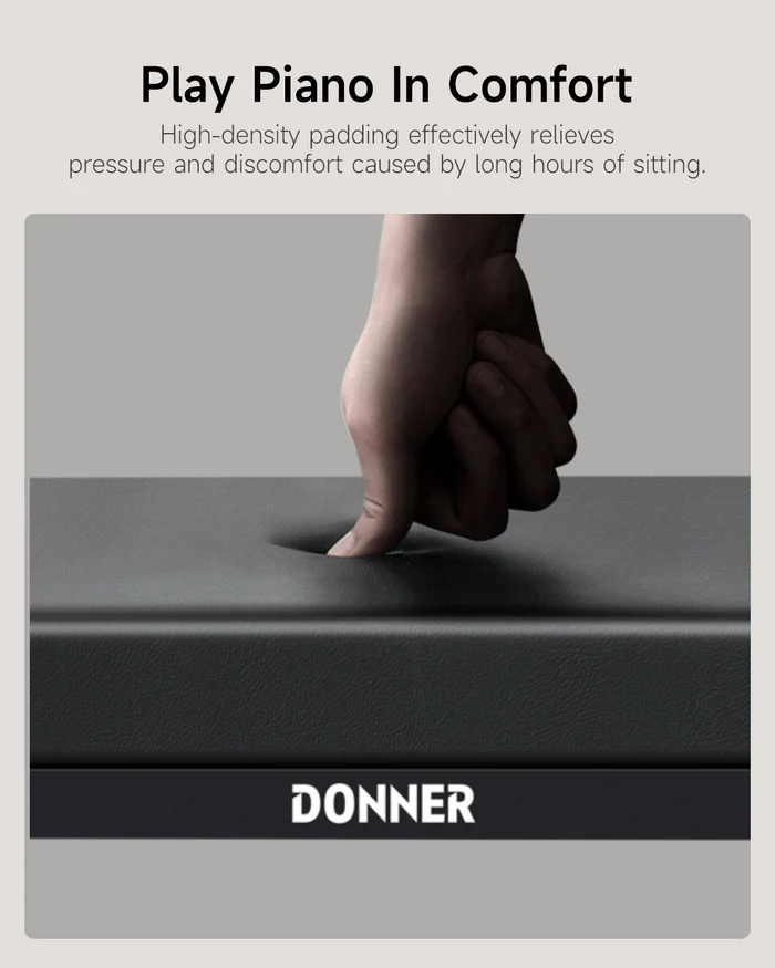 Ta ławka o wysokości 46 cm idealnie pasuje do Twojego pianina. Gruba gąbka zapewnia wyjątkowy komfort, pozwalając na grę lub ćwiczenia przez wiele godzin bez dyskomfortu.