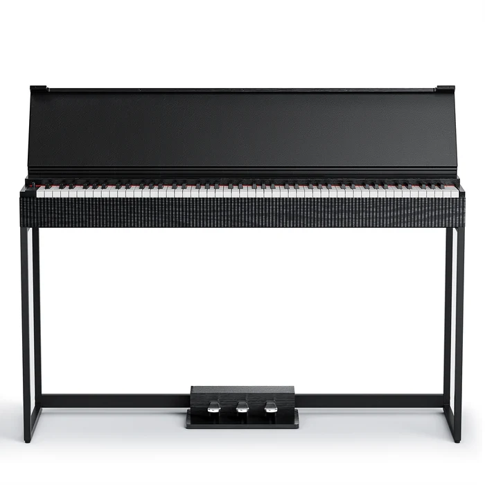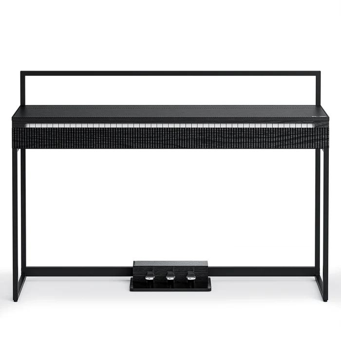 Minimalistyczna forma z czystymi liniami geometrycznymi, miękką pokrywą klawiatury z imitacji skóry oraz falistą kratką głośnikową. Wymiary: szerokość 127 cm, głębokość 38 cm – kompaktowe, lecz pełnowymiarowe. W zestawie półpedał sustain, regulowana ławka oraz dostęp do platformy Melodics z lekcjami online.