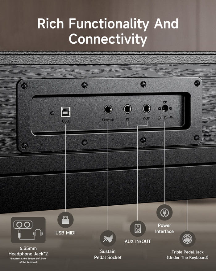 - Łączność: AUX IN/OUT, USB MIDI, SŁUCHAWKI, SUSTAIN, TRZY PEDAŁY (funkcja półpedału)