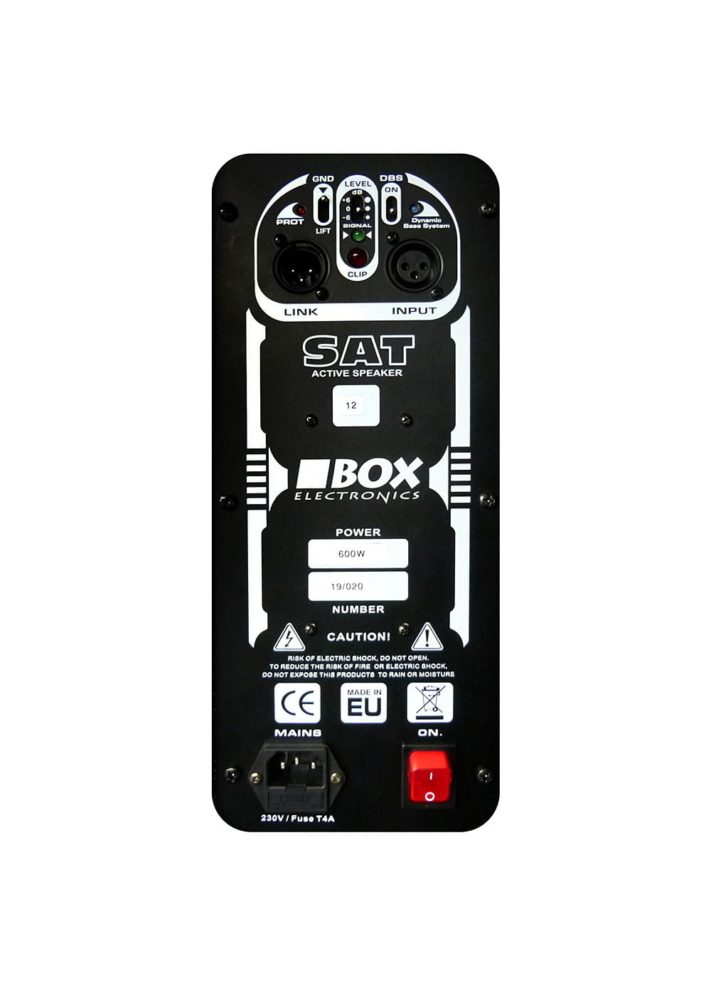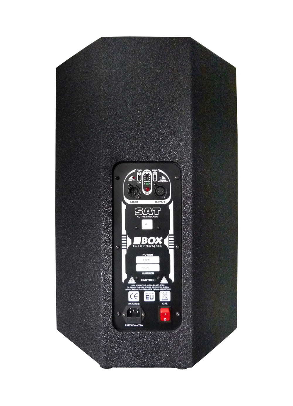 SAT-12EM to aktywna kolumna głośnikowa o mocy 600W, wyprodukowana przez znaną polską firmę Box Electronics na nasze specjalne zamówienie. W masywnej obudowie pokrytej hybrydową powłoką poliuretanową zamontowane są głośniki firmy EMINENCE: 12” basowy oraz driver 1” z tubą. Na tylnym panelu znajduje się selektor poziomu sygnału wejściowego, włącznik systemu DBS, odcięcie „masy” oraz niezbędne kontrolki. Jest też gniazdo i włącznik zasilania, oraz symetryczne wejście i wyjście liniowe na złączach XLR.