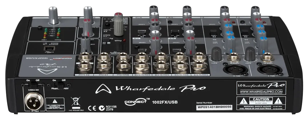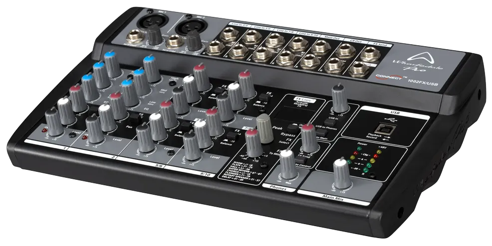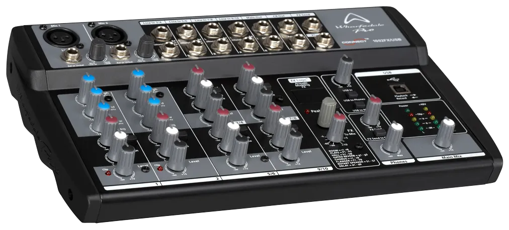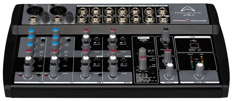 WHARFEDALE CONNECT 1002FX/USB to idealny towarzysz występów na żywo na małą skalę i dyskretnych instalacji dźwiękowych, w których po prostu nie ma miejsca na pełnowymiarowy mikser. Choć oferuje bogactwo funkcji do miksowania i nagrywania, zajmuje niewiele miejsca. Zastosowanie pokręteł obrotowych zamiast większych liniowych faderów oznacza oszczędność miejsca, dzięki czemu mikser można umieścić w małych przestrzeniach. FX logic bit DSP oferuje łącznie 56 efektów (tylko 1002FX/USB i 1202FX/USB). Obejmują one różnorodne opóźnienia, pogłosy, chorus itp., co pozwala uzyskać profesjonalny efekt w miksie i nadaje się do bardziej kreatywnych stylów inżynierii dźwięku.